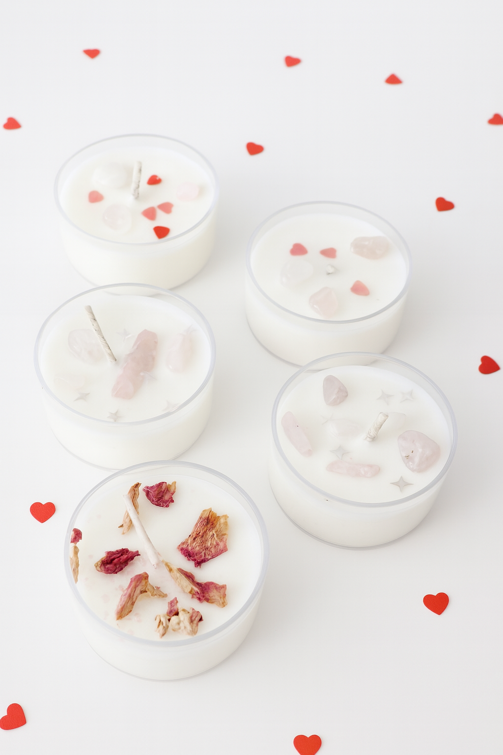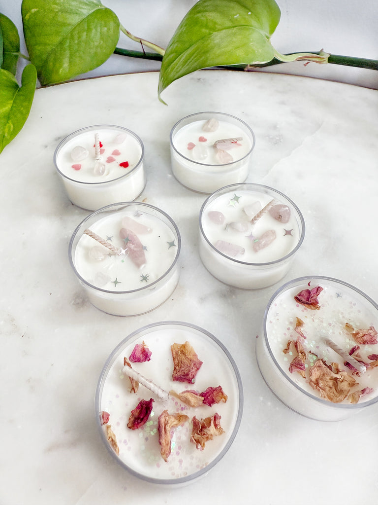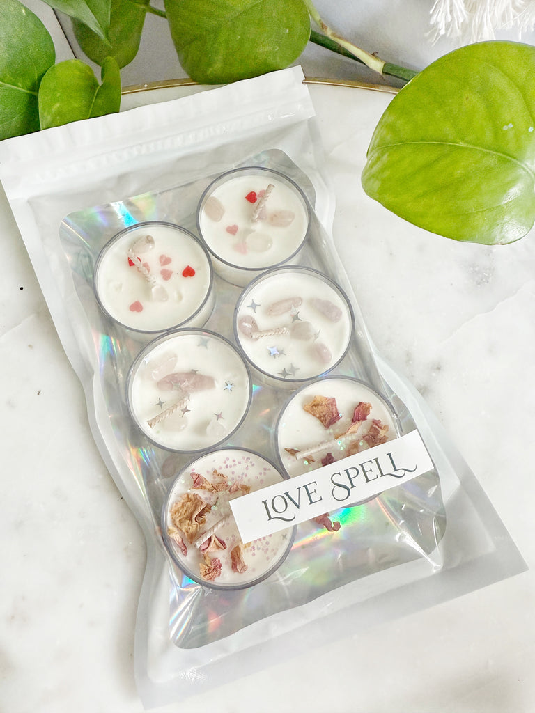 Enchant your space with our Love Spell tea lights, crafted with intention to attract love, harmony, and emotional warmth. Each hand-poured candle is infused with soy wax and topped with delicate adornments, dried rose petals, shimmering glitter, crystal chips, and tiny heart or star accents, making every piece unique and magical.